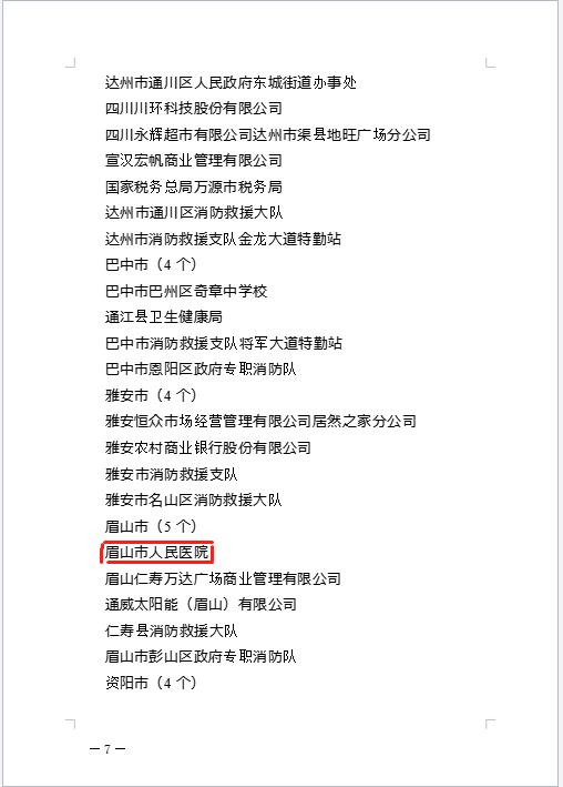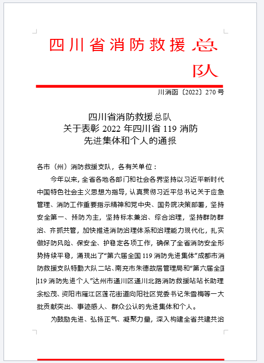 在12月9日,四川省消防救援总队《关于表彰2022年四川省119消防先进集体和个人的通报》中,我院被评为2022年四川省119消防先进集体荣誉称号。