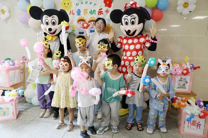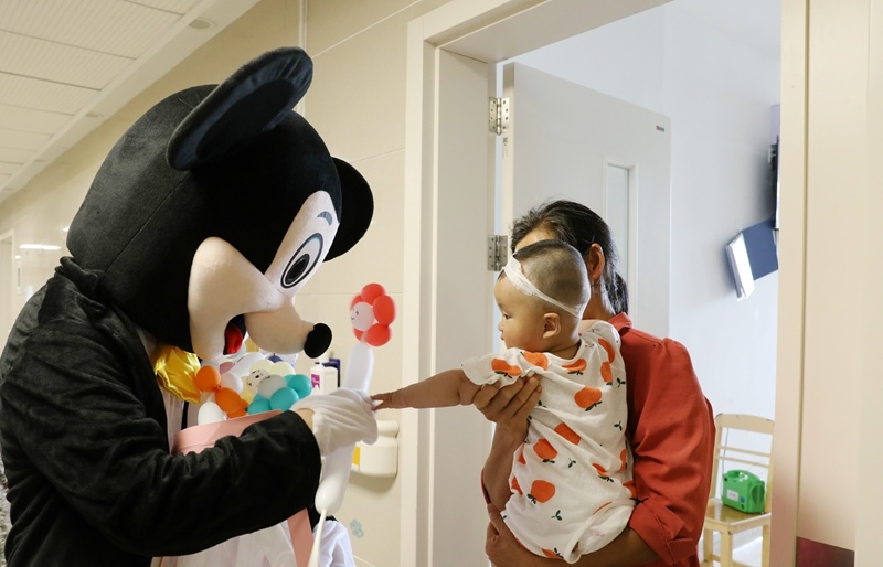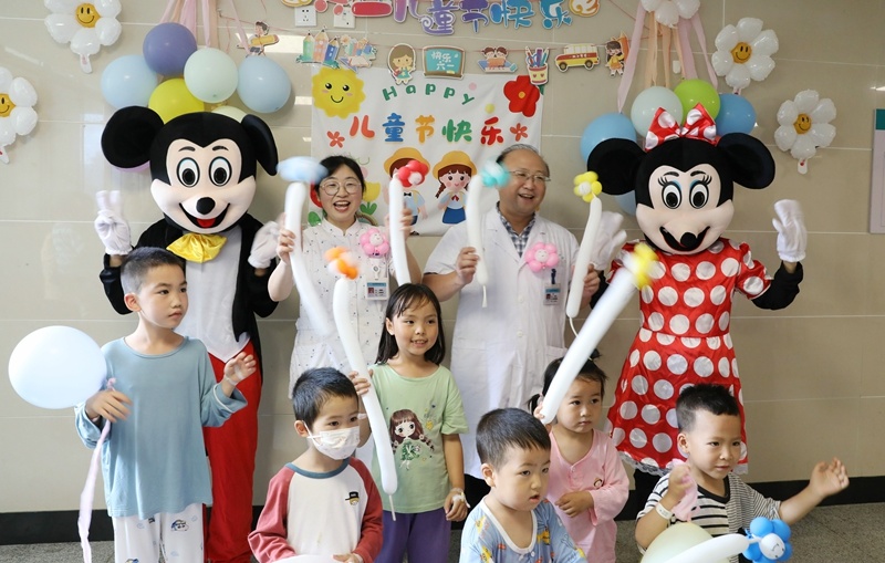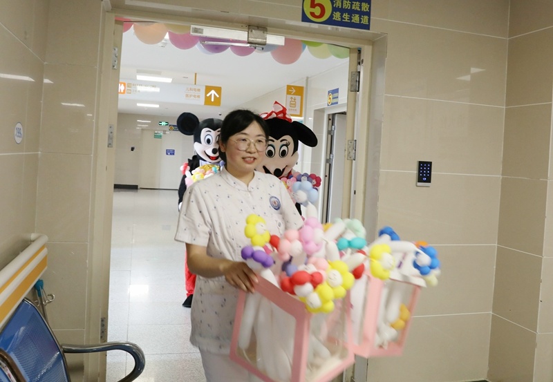 气球、玩具……可爱的“米奇”、“米妮”抱着礼物一出场,顿时吸引来了许多小朋友,瞬间病房里热闹极了。